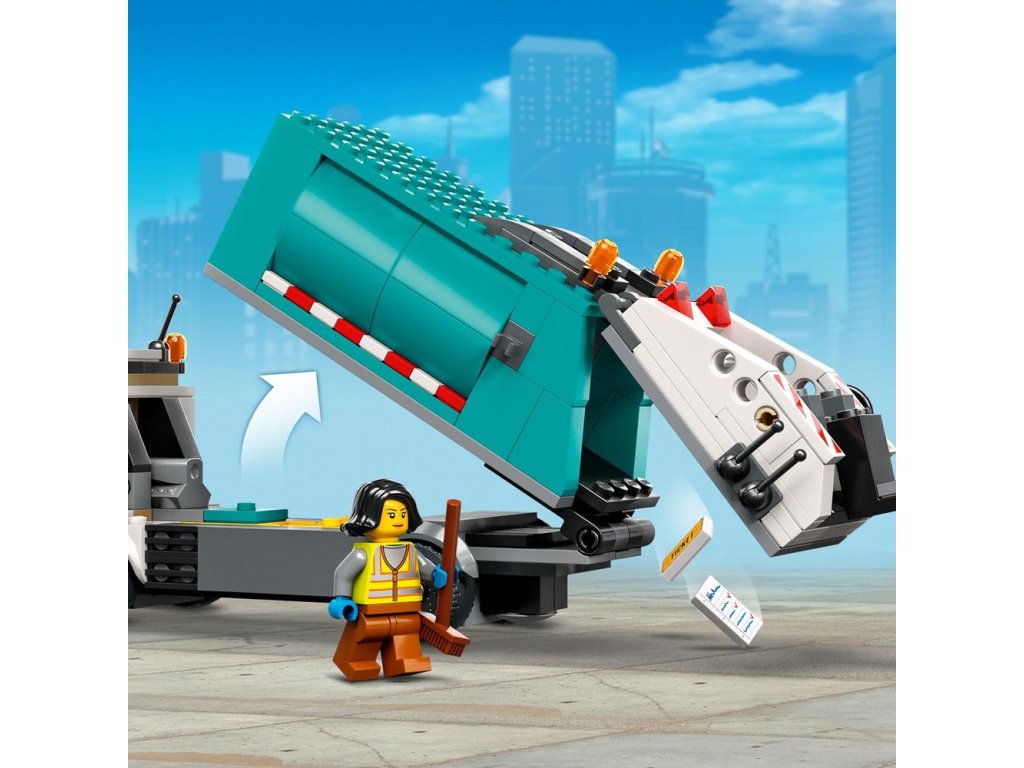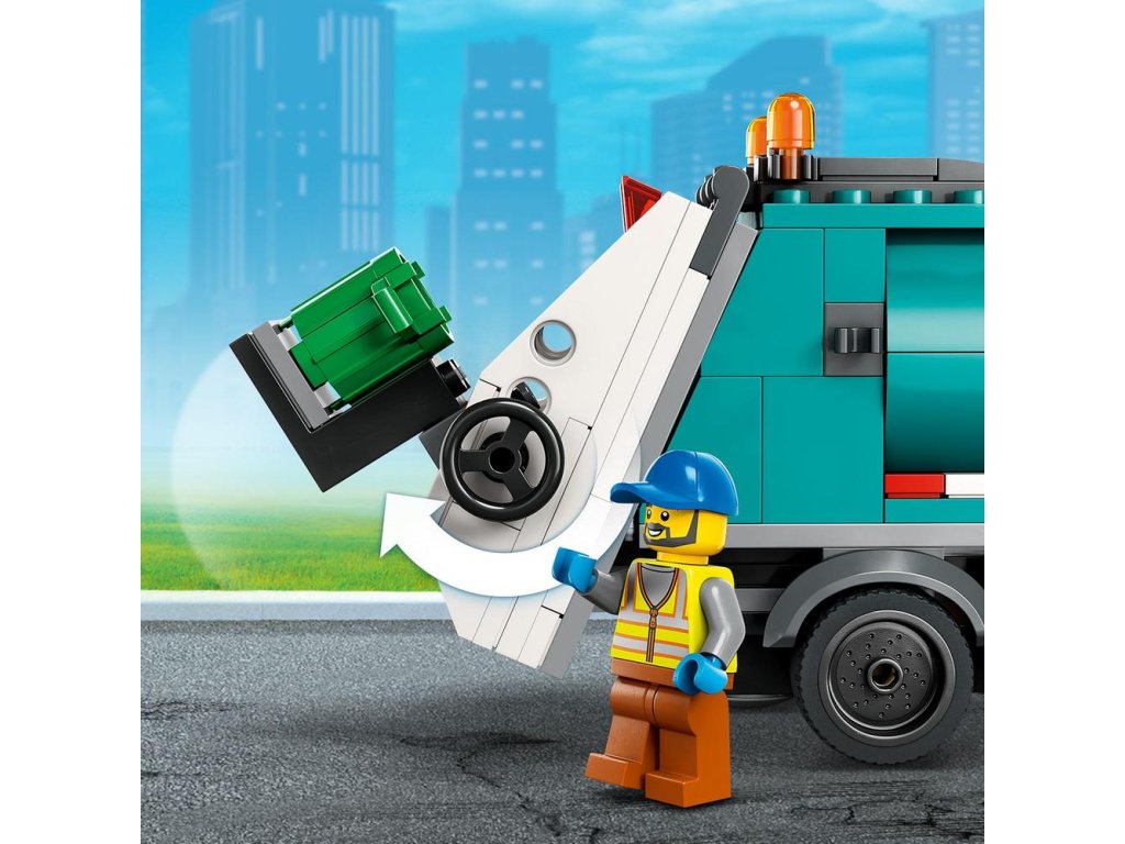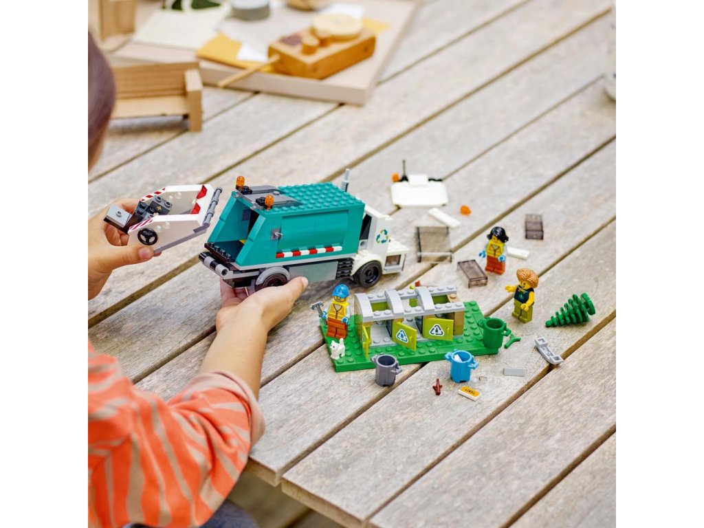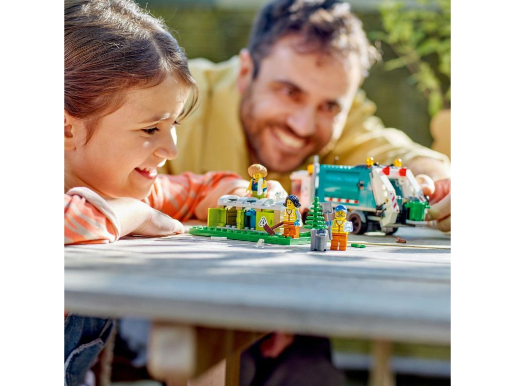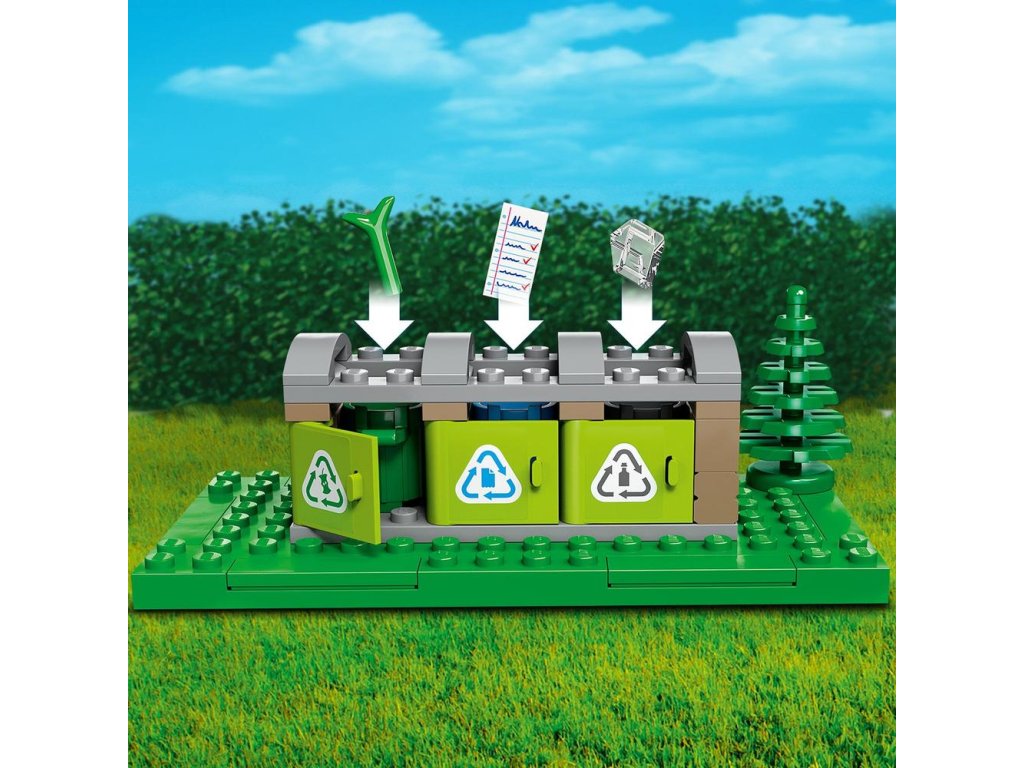 - Čo je v balení? – Všetko, čo deti potrebujú na postavenie smetiarskeho auta LEGO® city a recyklačného strediska, ako aj 3 kontajnery, 3 minifigúrky a figúrka mačky