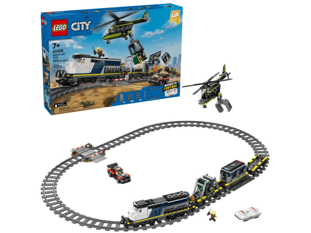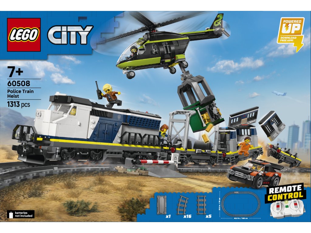 - STAVEBNICA POLICAJNÉHO VLAKU – Model LEGO® City Lúpež v policajnom vlaku (60508) obsahuje motorový vlak, vrtuľník, pretekárske auto, koľajnice a 6 minifigúrok na tvorivé hry