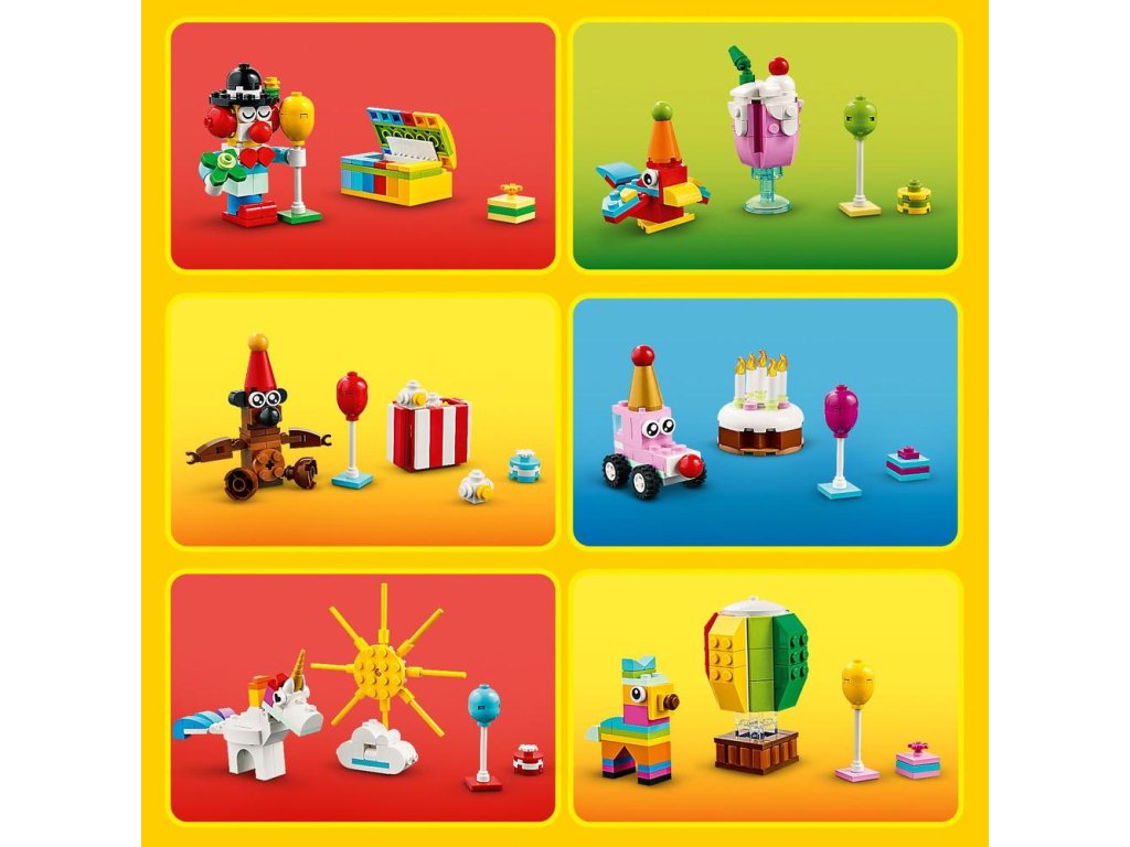 Podeľte sa o chvíle tvorivej zábavy s touto pestrofarebnou zbierkou kociek. Každé zo 6 vrecúšok obsahuje kocky a zrozumiteľný tlačený návod na postavenie 2 jednoduchých modelov. Nechýba medzi nimi medvedík, klaun, jednorožec, piñata, dúha, torta ani malé darčeky. Ide o skvelú skupinovú aktivitu na oslavy – ale tvorivé stavanie sa nekončí ani potom! V appke LEGO Builder navyše nájdete digitálnu verziu návodu na stavanie.