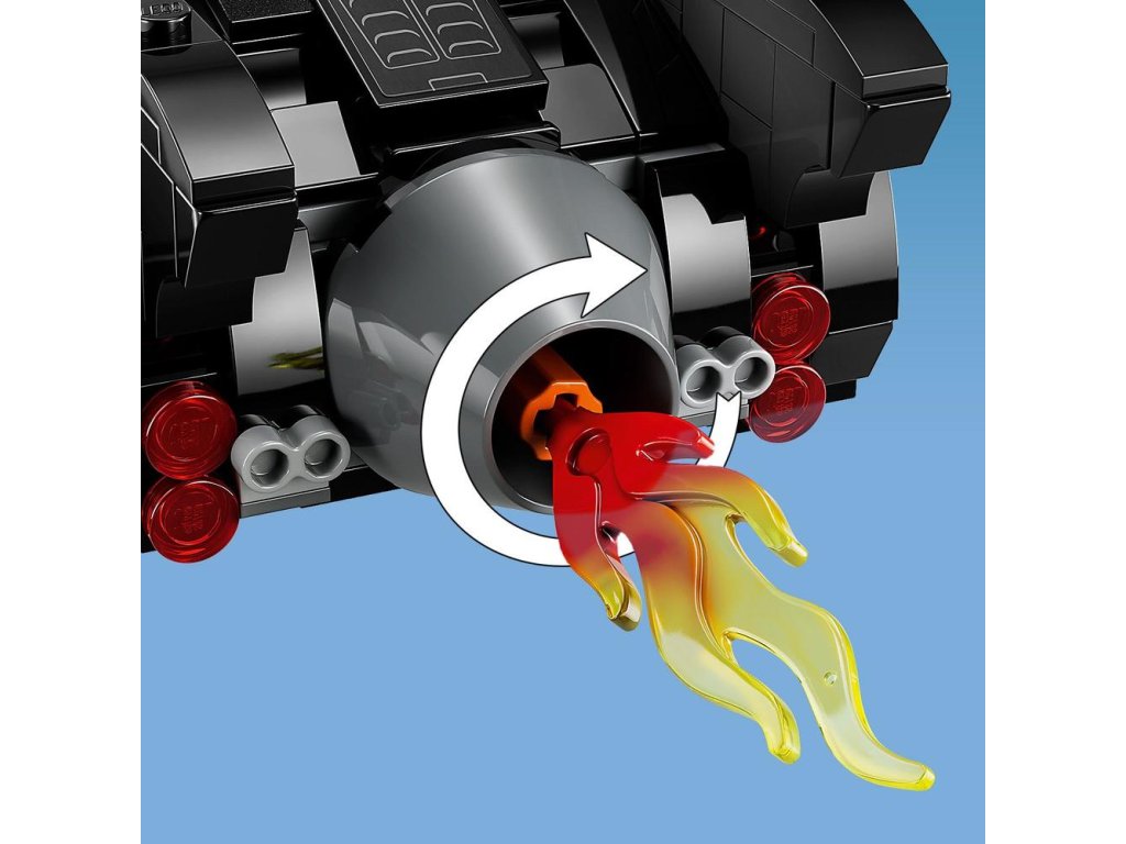 - Autentická akcia – Vozidlo má otvárací kokpit pre minifigúrku Batmana, ovládanie, ktoré zdvihne 2 blastery do správnej polohy, otvárací kufor a horiaci výfuk