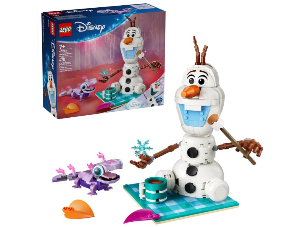 - STAVEBNICA HRAČKÁRSKEHO SNEHULIAKA LEGO® – Pútavá stavebnica snehuliaka Olaf a Bruni na zábavnom pikniku (43287) prináša postavičky LEGO ǀ Disney Ľadové kráľovstvo Olafa a Bruniho, farebnú piknikovú deku a ďalšie prvky