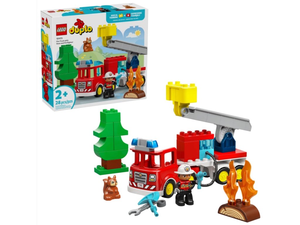 - HASIČSKÁ HRAČKA LEGO® DUPLO® – S touto hračkou si batoľatá môžu predstaviť, že sa z nich stali hrdinovia bežných dní, ktorí z rebríka hasia horiace poleno hadicou, zatiaľ čo veverička sleduje akciu z diaľky