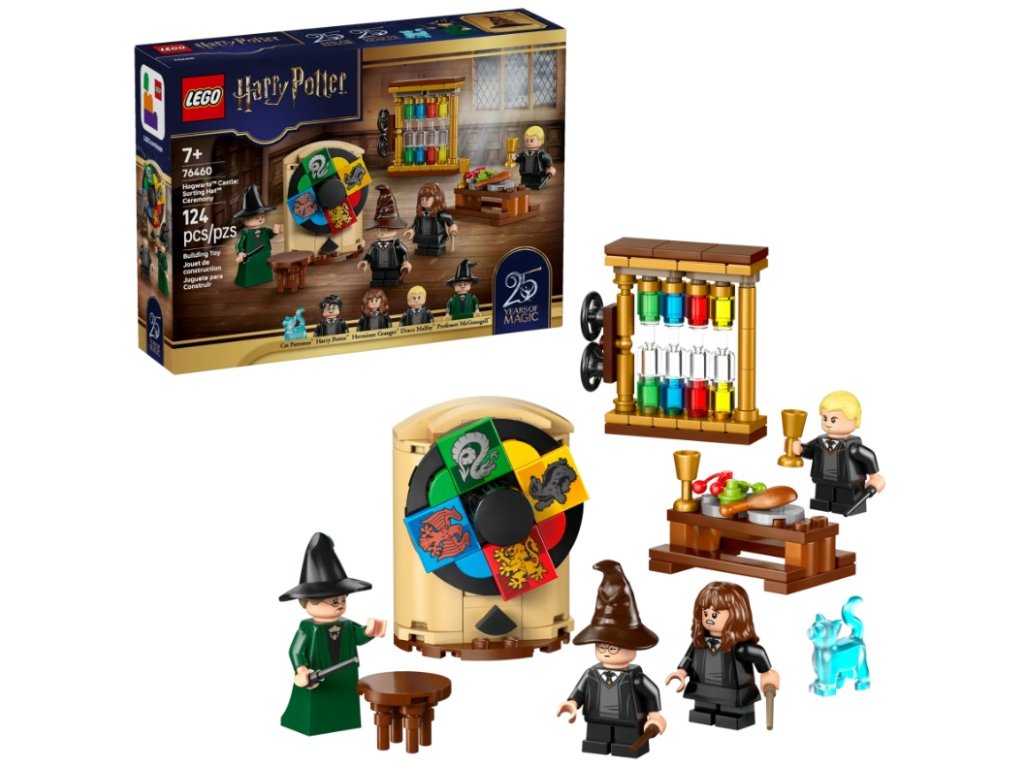 - 4 MINIFIGÚRKY LEGO® HARRY POTTER™ – Zahrajte sa na ceremoniál s Triedacim klobúkom spolu s profesorkou McGonagallovou, Harrym Potterom, Hermionou Grangerovou a Dracom Malfoyom, pričom každý z nich má doplnok v podobe prútika
