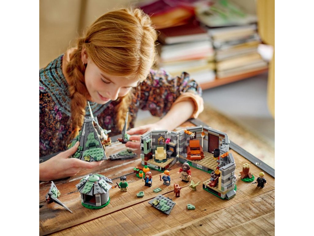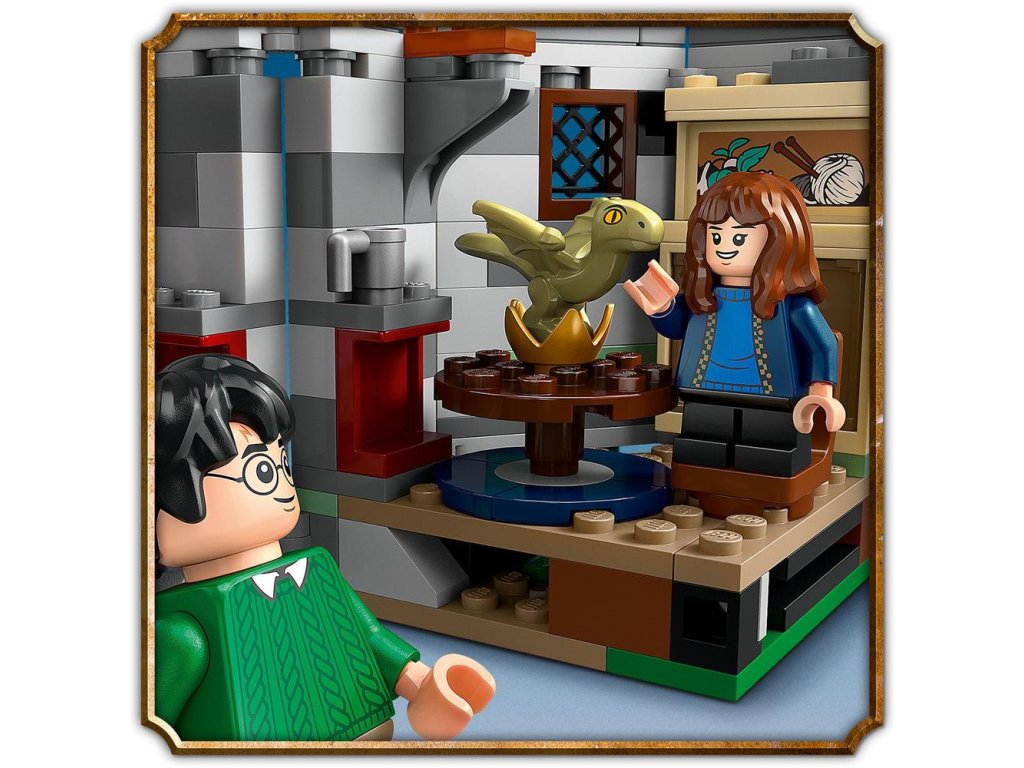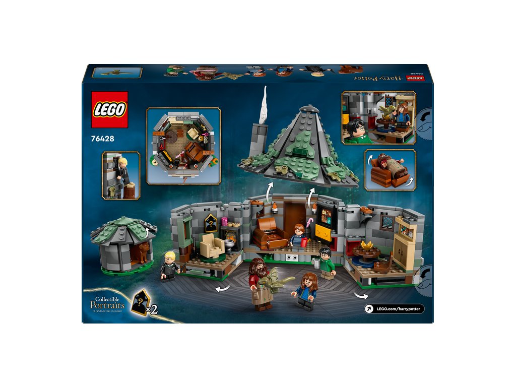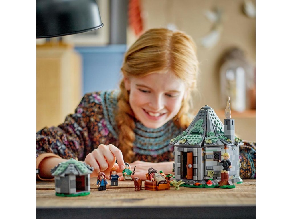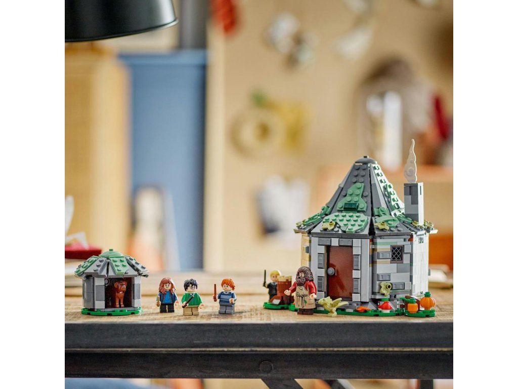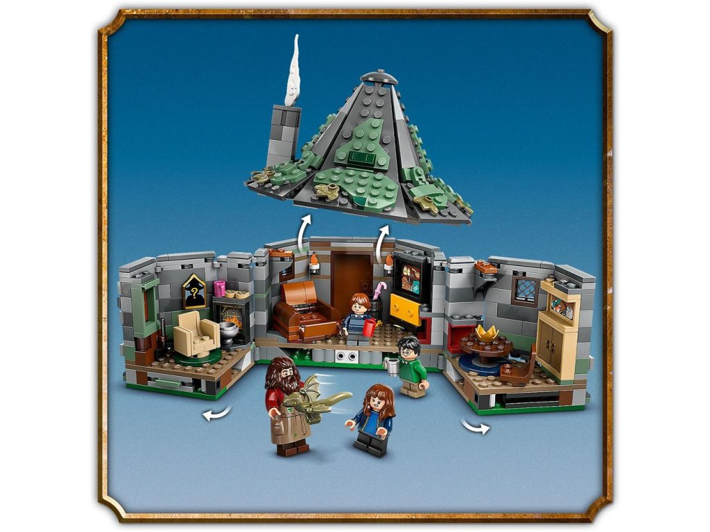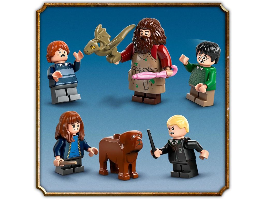Táto zostaviteľná stavebnica kultového domu z Harryho Pottera obsahuje 5 minifigúrok LEGO – Harryho Pottera, Hermionu Grangerovú, Rona Weasleyho, Draca Malfoya a Rubeusa Hagrida, navyše figúrky draka Norberta a psa Chlpáčika.