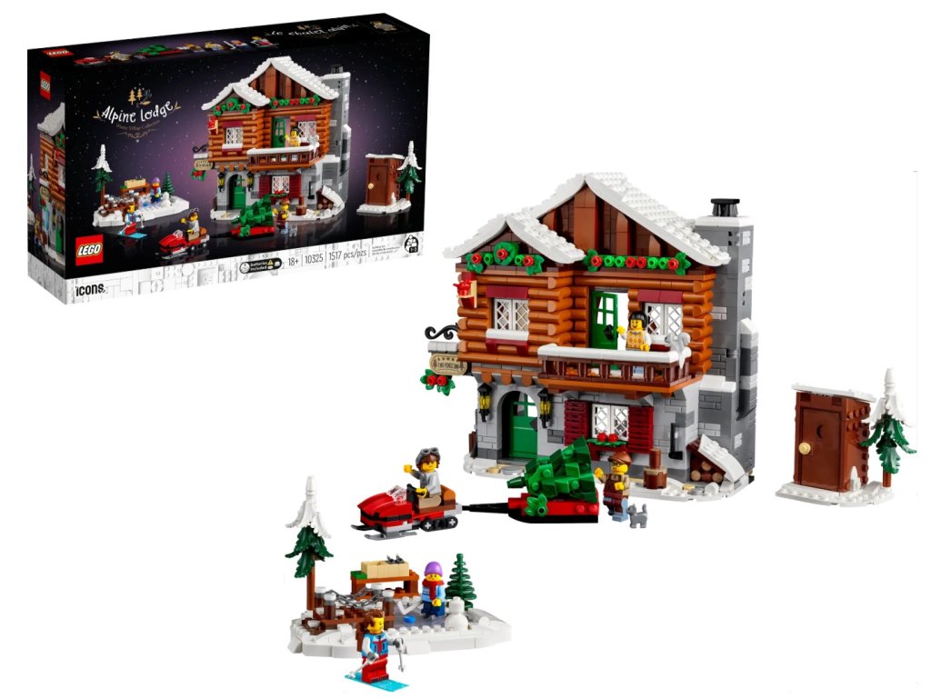 - Čo nájdete v balení? – Všetko, čo budete potrebovať na zostavenie trojposchodovej chaty v Alpách, vonkajšie klzisko, WC, snežný skúter s prívesom, a takisto vianočný stromček, 5 minifigúrok a figúrky mačky, veveričky a vtáčika