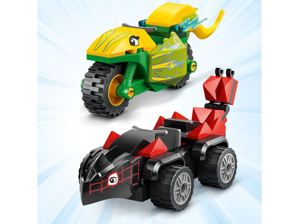 - Dobrodružné hračkárske stavebnice LEGO® s autíčkami – Deti sa pridajú k Spinovi v stegosaurom aute, ktorý prenasleduje zlú Electro na jej dilophosaurej motorke, pretože ukradla vzácny kryštál