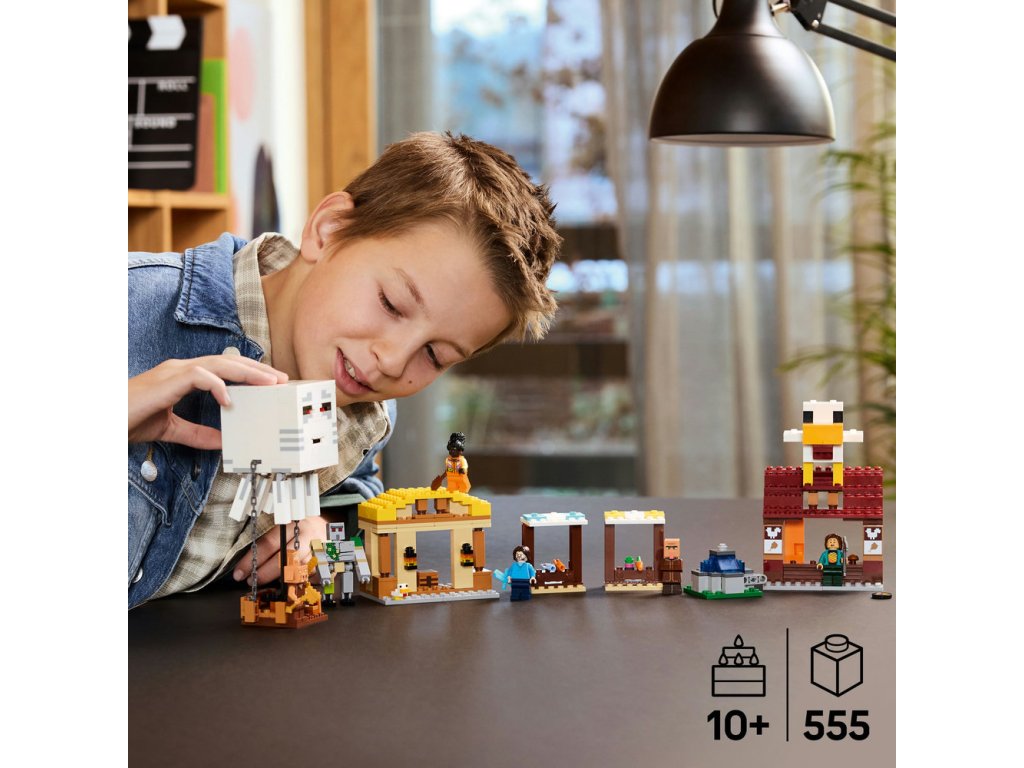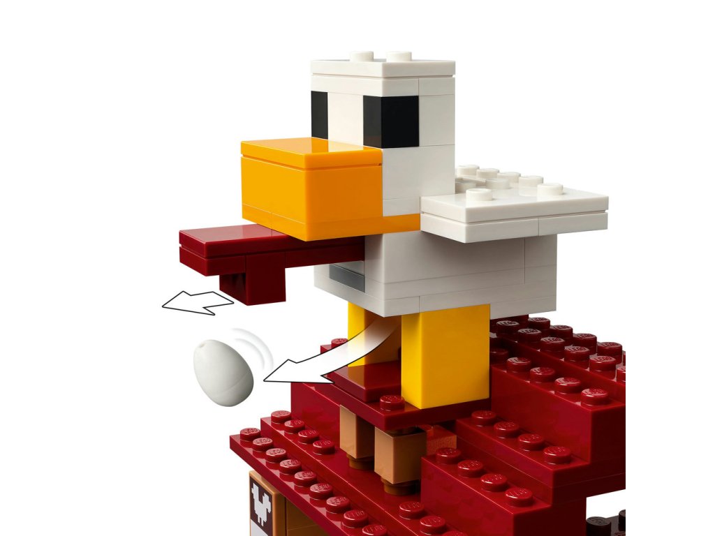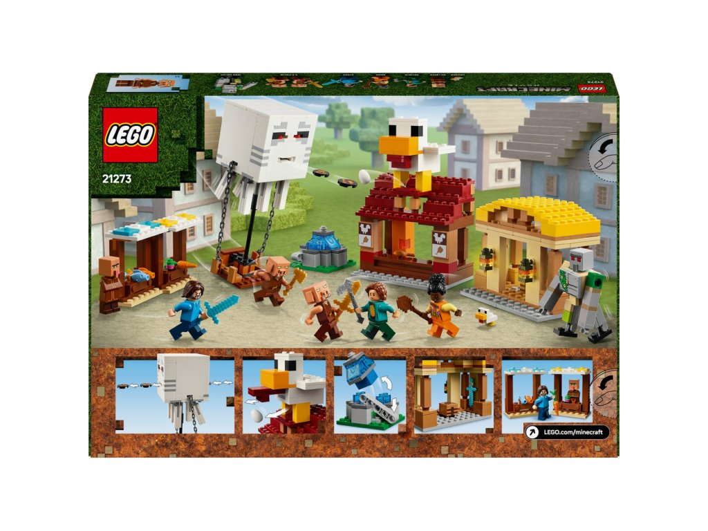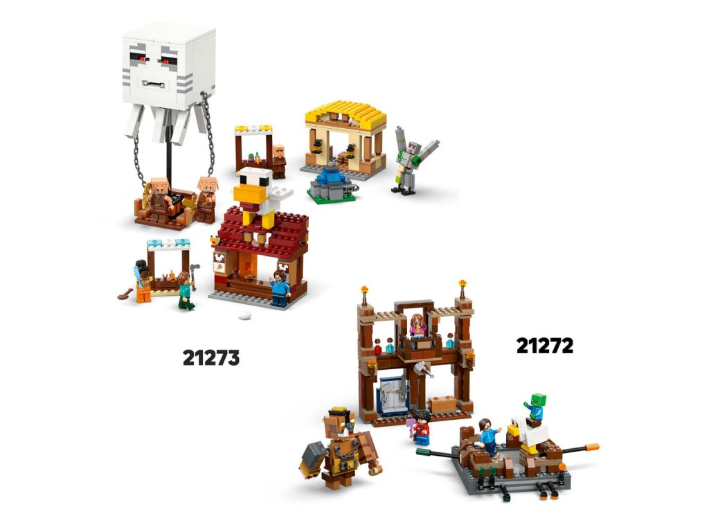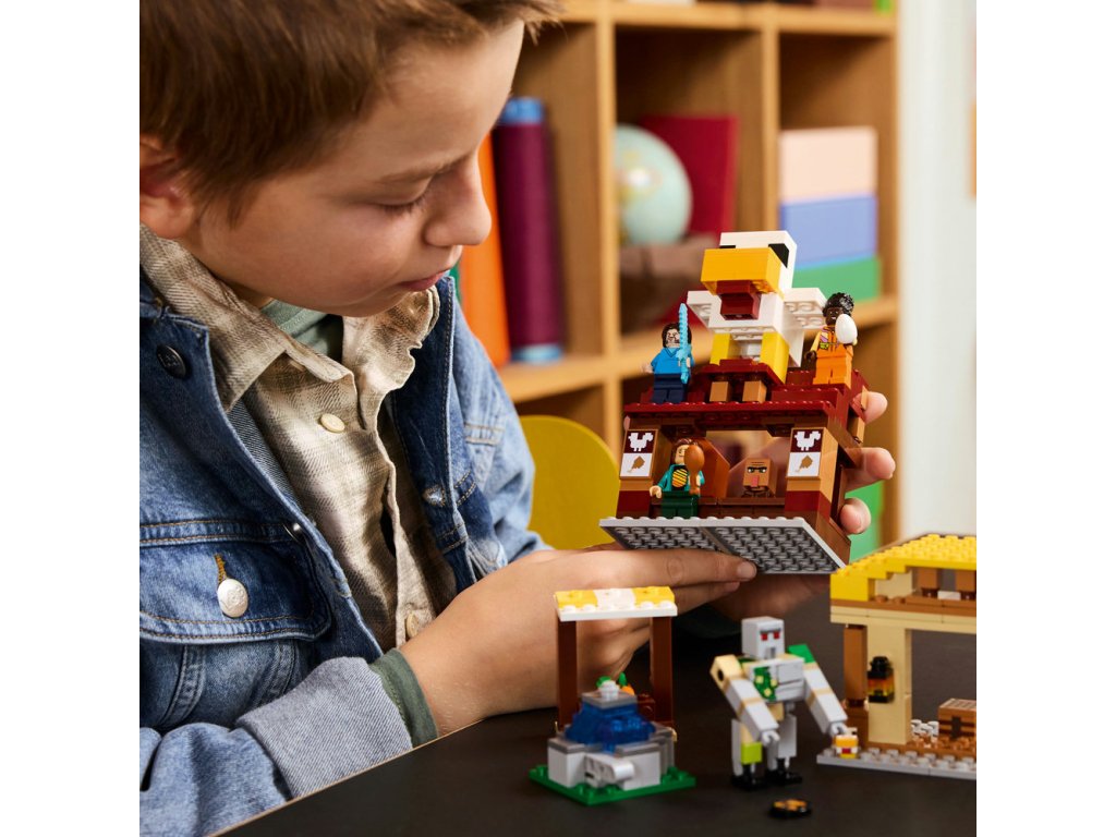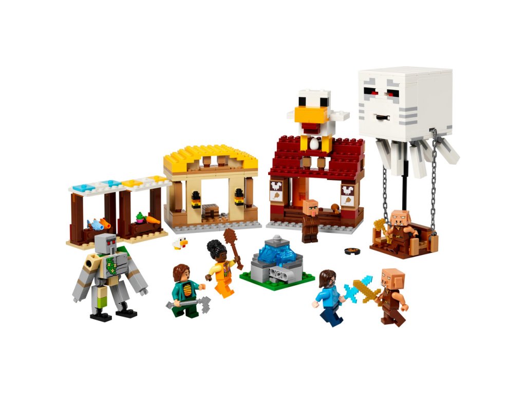 - Stavebnica LEGO® inšpirovaná videohrou – Keď piglini odpália rakety zo svojho balóna v podobe Ghasta, čím fontána „vybuchne“, deti musia brániť dedinčanov, Stevovu reštauráciu s vyprážaným kuracím mäsom a remeselnú chatrč