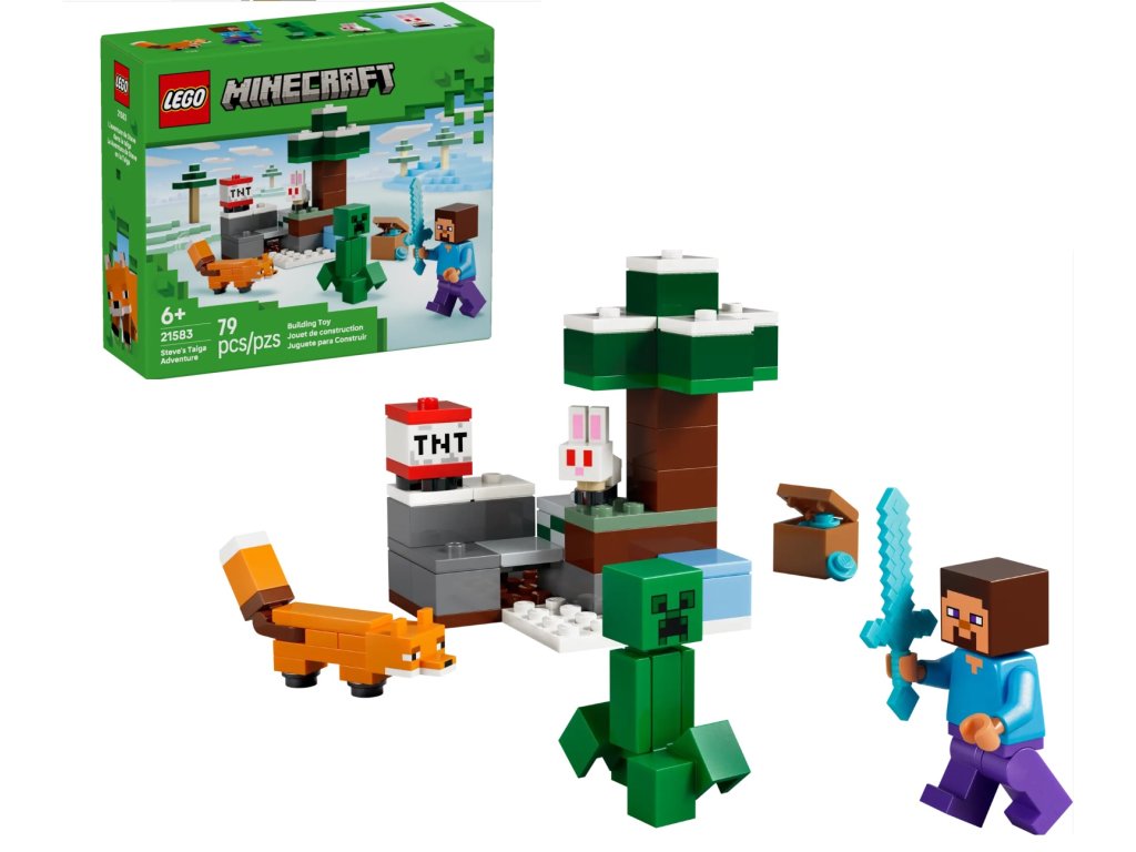 - STEVE A DOBRODRUŽSTVO V TAJGE – Pustite sa do bojovej akcie v štýle Minecraft®, hľadania pokladu a výbušnej zábavy so stavebnicou LEGO® (21583) pre chlapcov, dievčatá a deti od 6 rokov, ktoré milujú hračky podľa videohier