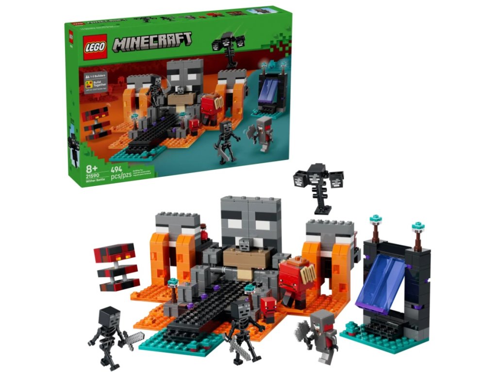 - 7 POSTAVIČIEK MINECRAFT® – Pridajte sa v stavebnici LEGO® Minecraft® Súboj s Witherom (21590) k figúrkam Karmínového bojovníka a 2 kostlivcov Wither, nechýbajú ani figúrky tvorov, ako sú kráčadlo, malé kráčadlo, Wither a pekelný sliz