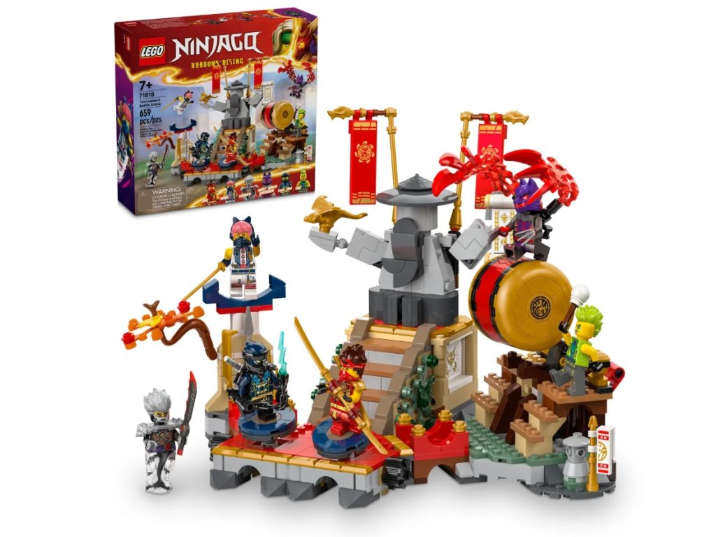 Táto stavebnica zo série LEGO® NINJAGO obsahuje 2 pohyblivé plošiny, na ktorých si deti môžu zahrať napínavé súboje medzi nindžom a zloduchom, veľký bubon, ktorý môžu odtlačiť zo stojana smerom a odkotúľať do arény, a schodisko, ktoré sa zrúti stlačením páky a všetky postavy tým spadnú na zem.