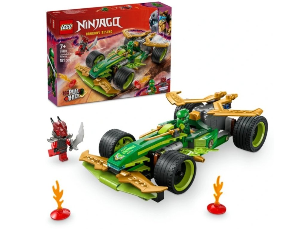 - Pretekárske autíčko na hry na postavy – Chlapci a dievčatá od 7 rokov si môžu zinscenovať superrýchlu akciu z 3. sezóny televíznej relácie NINJAGO® Dragons Risings Lloydovým pretekárskym autom s naťahovacím motorom