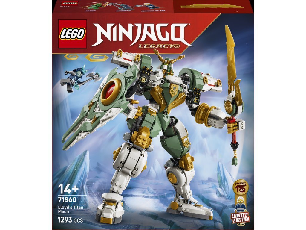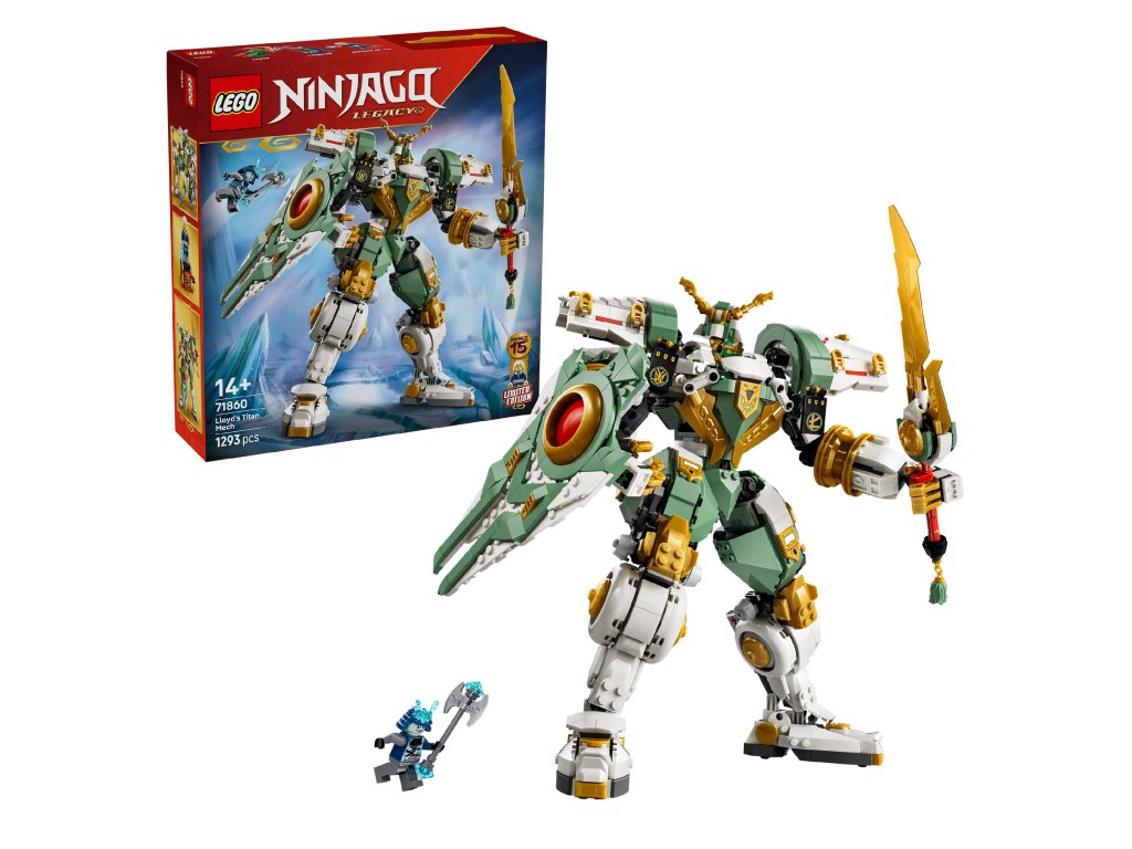 - STAVEBNICA S AKČNOU FIGÚRKOU – Model Lloydov titanský robot: 15 rokov NINJAGO (71860) pre chlapcov, dievčatá a nostalgických fanúšikov od 14 rokov vzdáva hold 15. výročiu televízneho seriálu LEGO® NINJAGO®