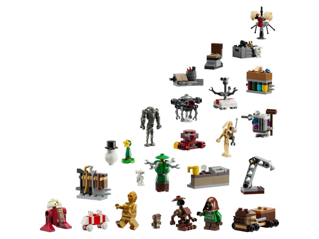 - 8 zostaviteľných droidov LEGO® – Pit droid, Dobíjací droid, Buzz droid, Lekársky droid (vianočný), B2EMO, droid Treadwell, Myšací droid (vianočný) a Prieskumný droid