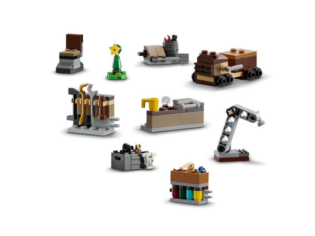 - 9 miniatúrnych hračkárskych stavebníc – Pracovný stôl, stolička, stojan s náradím, police, krabica s extra dielikmi pre droidov, žeriav a vedierko na postavenie dielne droidieho technika, ako aj zostaviteľné vozidlo Jawu a vianočný stromček