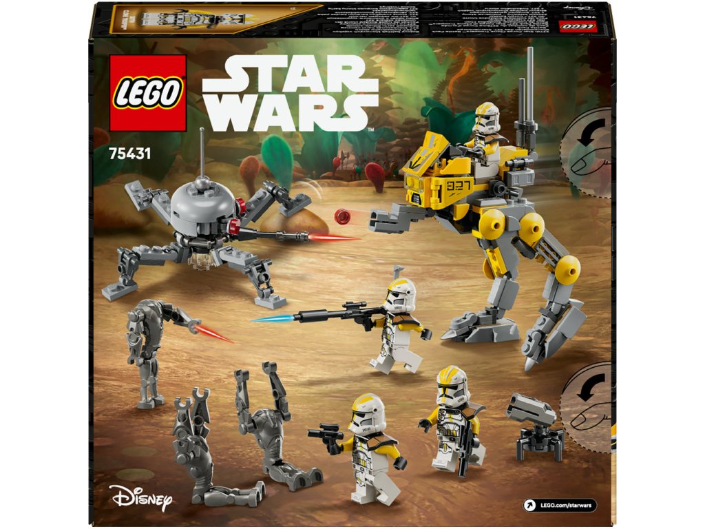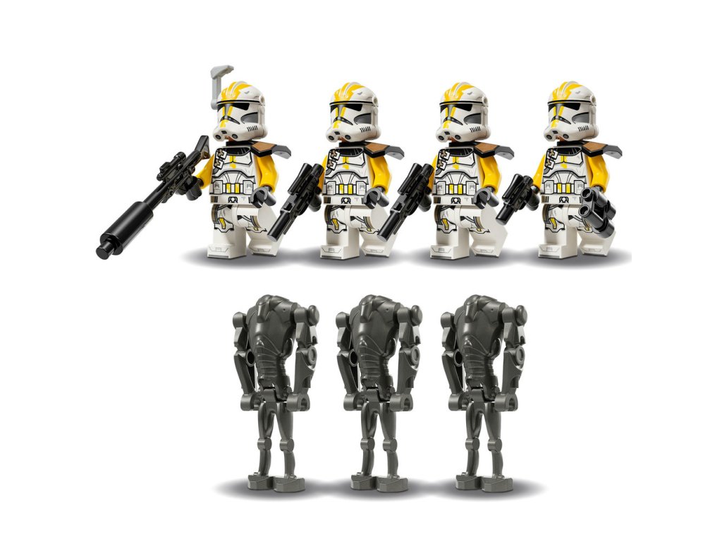 - 4 minifigúrky LEGO® Star Wars™ – 4 klonoví vojaci z 327. hviezdneho zboru s blasterovou pištoľou, 2 blastermi a blasterovou puškou, ako aj 3 figúrky LEGO super Bojových droidov
