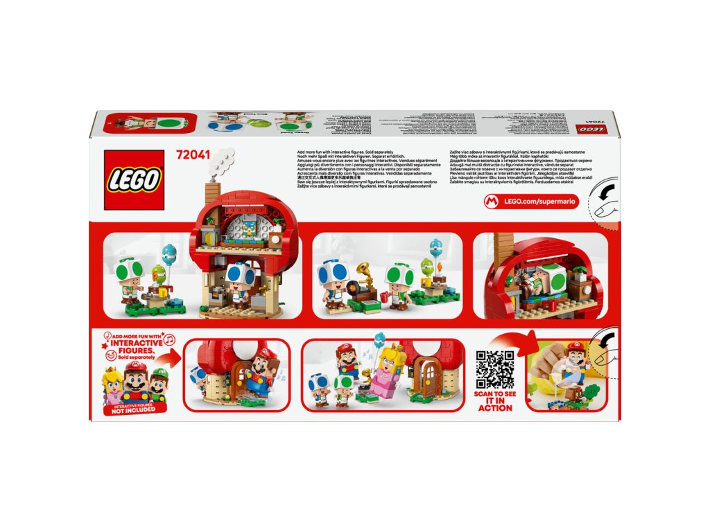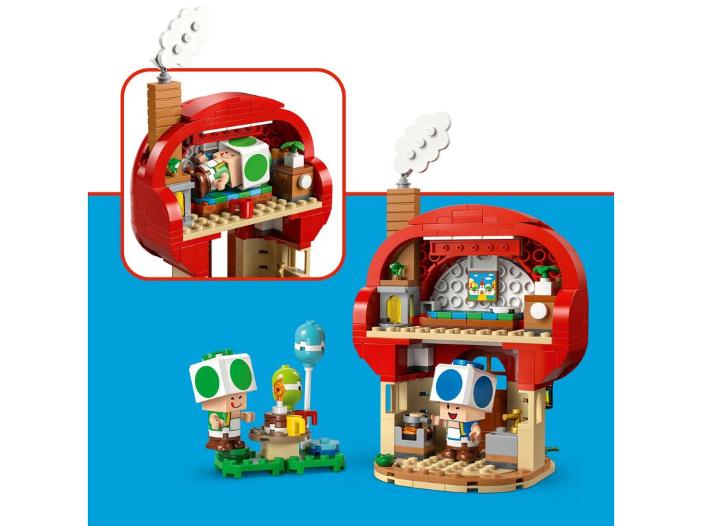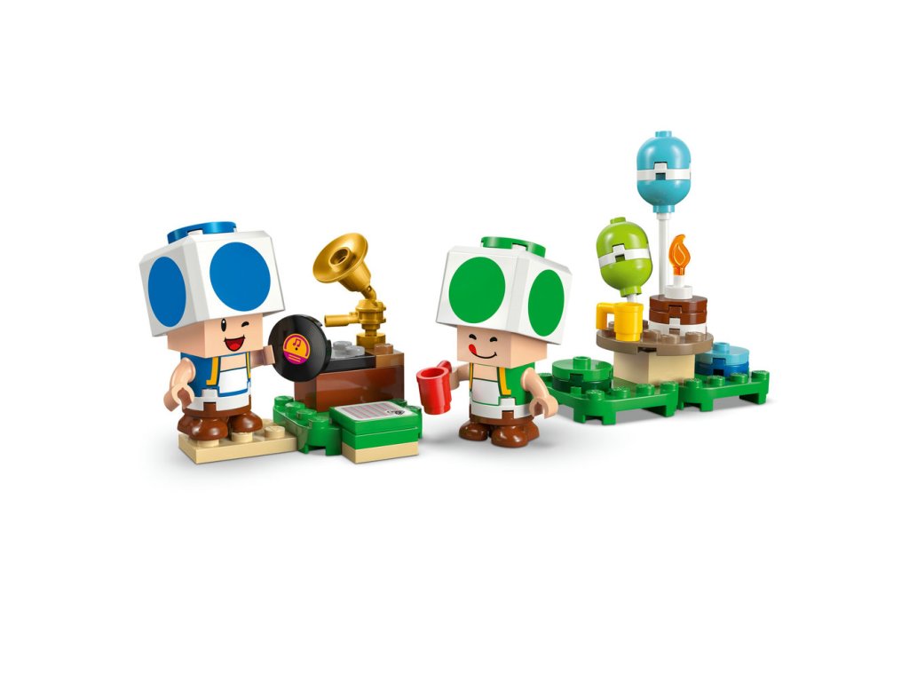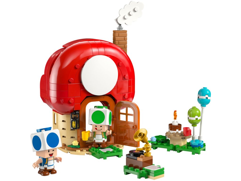 - Čas na párty – VToadovom dome nájdete kuchyňu a spálňu (s maľbou Hradu Peach na stene) a odnímateľný nábytok na ľahké hranie. Stavebnica obsahuje aj piknikový stôl, gramofón a párty doplnky