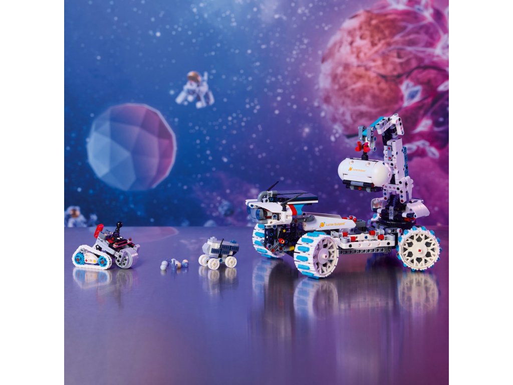 - Viac vozidiel a funkcií – Súčasťou stavebnice je terénny lunárny rover s tandemovým odpružením, riadením na 4 kolesá a výsuvnými solárnymi panelmi, plus menší ťažobný rover, kontajner na vzorky a MAPP rover
