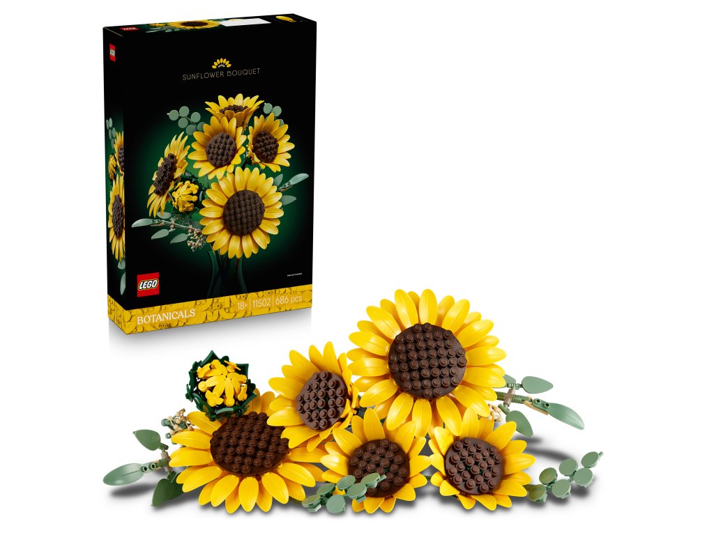 - SLNEČNICE LEGO® – Kytica obsahuje 6 slnečníc v rôznych fázach kvitnutia: púčik slnečnice, 3 rozkvitajúce slnečnice a 2 veľké, plne otvorené slnečnice